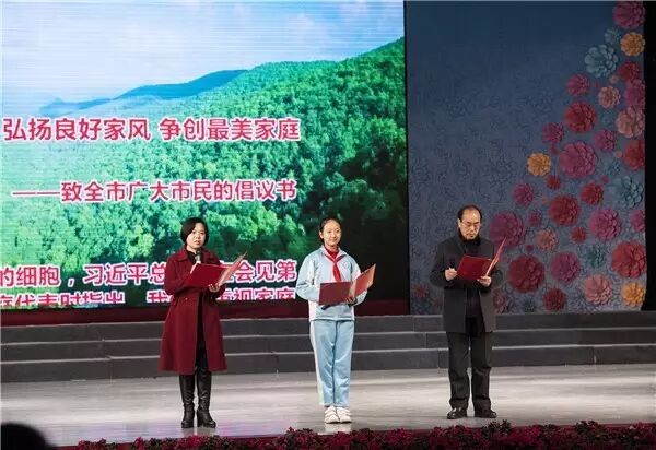 “全国最美家庭”代表杨爱华、“荆楚最美家庭”代表孙绘及少先队员共同宣读《传承优秀家训 弘扬良好家风 争创最美家庭》倡议书。