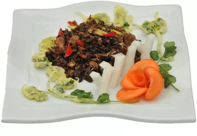 烹制程序:取根粑切片,山药切条,土豆和腊肉切丝,炸至金黄,根粑卷成形,勾芡淋汁即可食用。根粑是土家族的风味小吃,也是利川美食行业重点研发的菜品之一。土苗一家亲利用山药、根粑的独特口感,不仅口感香脆,营养丰富,风味独特,堪称上品。