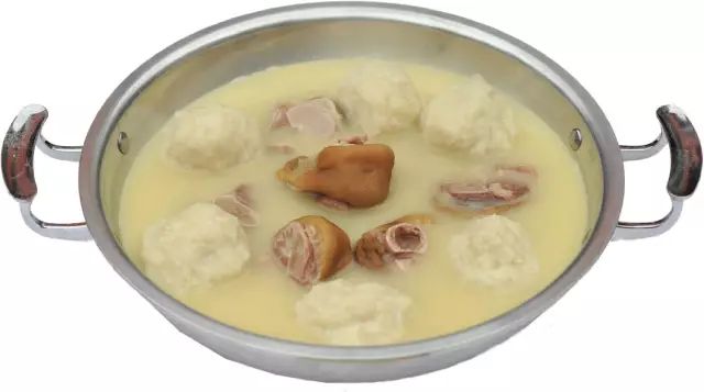 烹制程序:将山药去皮煮熟制成茸状,作狮子头形,过油。腊猪蹄宰块炖制成形,装入器皿。山药是利川特产,多年出口日本,有滋阴补阳药效,入药称之光条。山药狮子头与腊猪蹄同烹,营养极佳,烹山药之汤洁白无暇盛于平底锅,一锅六个狮子头状似六个花瓣,中间猪蹄尤若花蕊。看似一朵鲜花,食之人间美味。