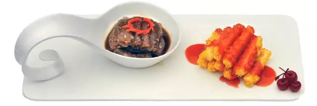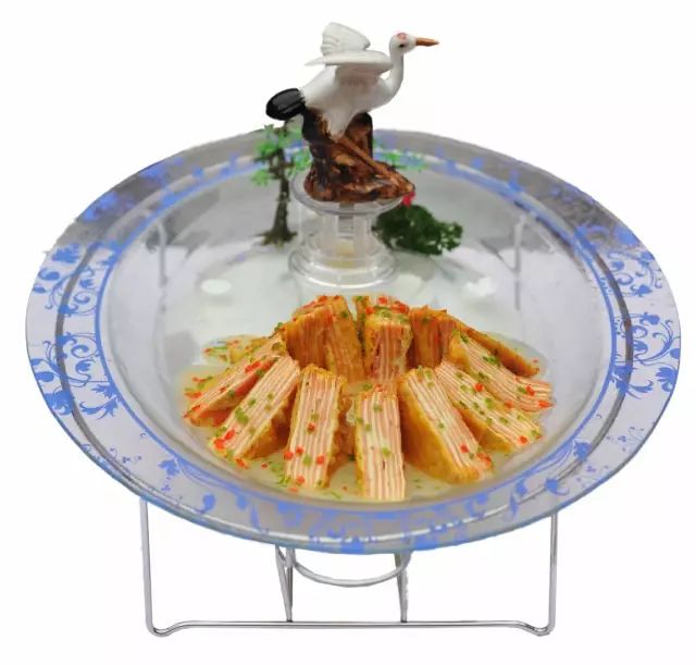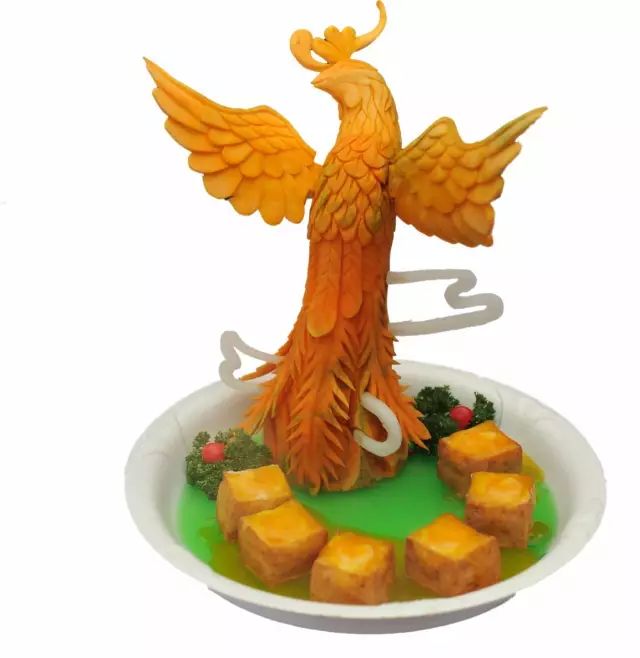 烹制程序:将老豆腐切成两寸方形,炸至金黄,挖空瓤入鱼茸,上笼蒸熟,浇汁即成。苗家部落烹制此菜,大盘后部餐雕金凤展翅,两边辅以发香菜作花,红樱桃缀芯,点题苗家有点红。底铺琼脂,色如翡翠,豆腐嵌入虾仁,再浇南瓜汁,色泽金黄,外观精美,食之嫩滑爽口,营养丰富。