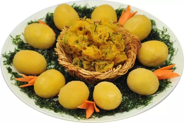 山药既是营养丰富的食品,含有淀粉和蛋白质,也是具有相当药用价值的食材,具有补脾养胃、生津益肺、补肾涩精的作用。利川是山药之乡,山药作为的特色产品,因味美并有益身体健康被人们所钟爱,一直成为土家族宴席上的重要菜品。雀巢金丝球主要采用山药、土豆蒸熟捣茸,然后切丝入味,包馅炸至成熟装盘即用。此菜色形俱美,入口即融,脆香生津,回味无穷。